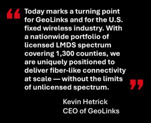 “Today marks a turning point for GeoLinks and for the U.S. fixed wireless industry,” said Kevin Hetrick, CEO of GeoLinks. “With a nationwide portfolio of licensed LMDS spectrum covering 1,300 counties, we are uniquely positioned to deliver fiber-like connectivity at scale — without the limits of unlicensed spectrum. Our Las Vegas demonstration with Intracom Telecom in Las Vegas showcases the next evolution of fixed wireless: multi-gigabit, interference-free broadband with carrier-grade performance. This milestone reflects our commitment to redefining how high-speed connectivity is deployed and scaled nationwide, and we’ll unveil the full scope of our next-generation spectrum initiative at WISPAPALOOZA 2025.”